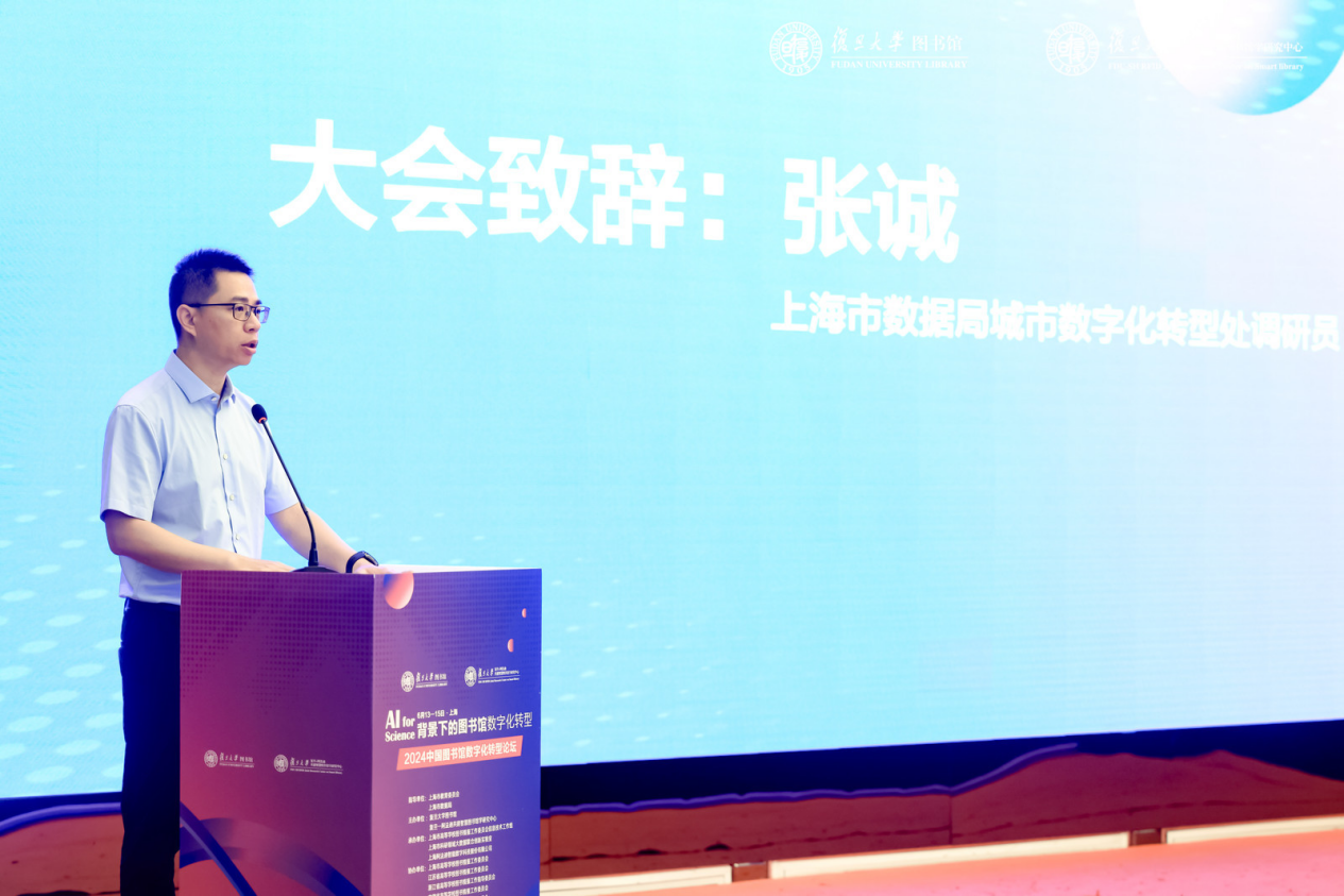 张诚在致辞中肯定了复旦大学建设上海市科研领域人文社科大数据联合创新实验室的工作。他期待图书馆能够成为连接科学与人文的桥梁,促进跨学科的交流与合作,为科学研究提供更深入的洞察,并助力科学家们发现新的研究方向。