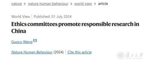2024年7月1日,复旦大学哲学学院教授、中国科协-复旦大学科技伦理与人类未来研究院院长王国豫以“Ethics committees promote responsible research in China”为题,在Nature Human Behaviour的“World View”栏目在线发表文章,阐述科研伦理在中国的发展历程,论证了伦理审查为何能促进负责任的创新。