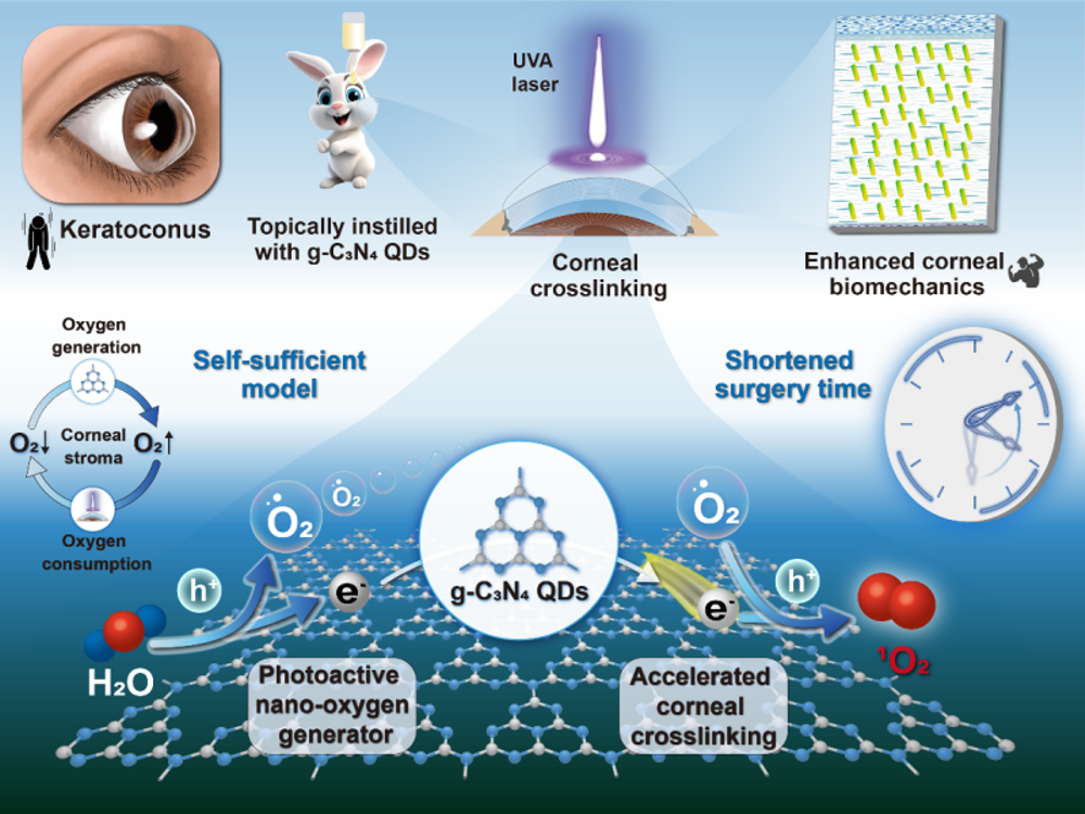 近日,复旦大学附属眼耳鼻喉科医院黄锦海、周行涛团队与哈佛大学陶伟教授团队强强联手,共同在《自然-通讯》(Nature Communications)发布了一项题为“Development of graphitic carbon nitride quantum dots-based oxygen self-sufficient platforms for enhanced corneal crosslinking”(《原位自供氧g-C3N4 QDs平台的研发及其提高角膜交联效果的机制研究》)的研究成果,详细阐述了以石墨相氮化碳量子点(g-C3N4 QDs)为核心的自供氧平台如何有效提升角膜交联效果及其作用机制。这是首次有研究揭示g-C3N4 QDs在角膜交联领域的应用潜力,标志着该领域研究新的重要突破。