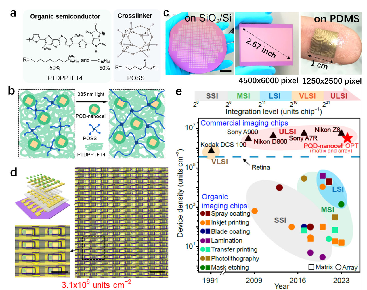 图1. (a)光刻胶组成;(b)光刻胶聚集态结构;(c)在不同衬底上加工的有机晶体管阵列;(d)有机晶体管阵列结构示意图及光学显微镜照片;(e)有机光电晶体管成像芯片(PQD-nanocell OPT)与现有商用CMOS成像芯片以及其他方法制造有机成像芯片的像素密度对比。