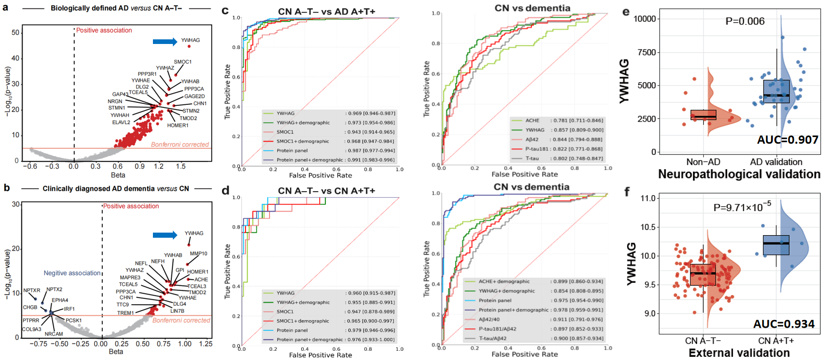 基于大样本队列数据,研究纳入了认知正常、轻度认知障碍和AD共707名参与者。通过对SomaScan平台检测的脑脊液蛋白质组学数据进行深入分析挖掘,郁金泰教授团队在6361个蛋白质中筛选出对AD生物学诊断和临床诊断最重要的生物标志物,分别为YWHAG、SMOC1、TMOD2和PIGR这四个蛋白和ACHE、YWHAG、PCSK1、MMP10和IRF1这五个蛋白。与对照组相比,脑脊液YWHAG无论是在生物学定义的AD组,还是在临床诊断的AD痴呆组,其差异表达均最显著。单独YWHAG、SMOC1和TMOD2以及上述四个和五个蛋白分别组成的panel对生物学和临床定义的AD均表现出良好的诊断性能。在单个蛋白中,YWHAG在识别生物学定义的AD和临床诊断的AD痴呆时表现最佳,准确度分别高达96.9%和85.7%。使用四个和五个蛋白分别组成的组合进一步将诊断准确性提高到98.7%和97.5%。重要的是,YWHAG、SMOC1、TMOD2和两种蛋白组合的卓越性能不仅在独立的外部队列中得到了验证,而且在区分尸检病理证实的AD与非AD时也得到了验证,甚至优于经典的AD脑脊液核心标志物(Aβ42、p-tau181、t-tau)以及这三种经典标志物的组合。除了卓越的诊断效能,它们在预测AD临床进展方面也表现良好,与AD核心病理和认知能力下降密切相关。