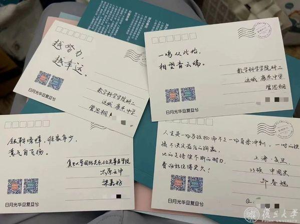 招生组组长、哲学学院党委副书记耿昭华介绍,为了给学弟妹们一份鼓励,增进学弟学妹对大学、对复旦的畅想,从2022年开始,招生组自主设计、印制2000多张带有复旦风景、复旦活动的明信片,同时邀请山西籍复旦师生亲手写上祝福的话,留下中学班级、复旦年级专业、姓名和联系方式,一并送到山西十多所中学。