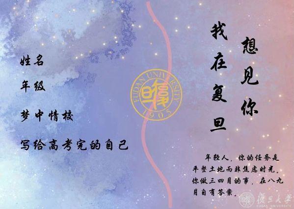 临走前,学姐递给她一张一分为二的心愿卡,左边写着姓名、梦想学校和写给高考后自己的话,右边写着“我在复旦想见你”。“如果高考后心愿达成,则重新合二为一”,学姐笑着对她说。