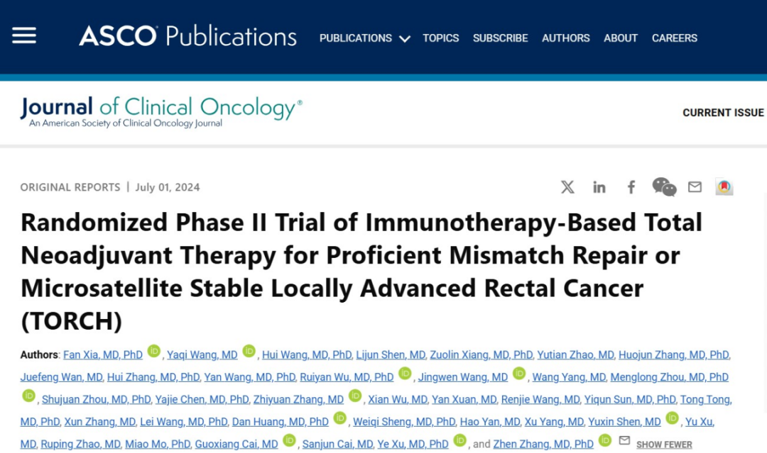 2024年7月1日,复旦大学附属肿瘤医院章真教授、徐烨教授牵头的一项多中心临床研究(TORCH研究)证实,通过“短程放疗联合化疗、免疫治疗的全程新辅助治疗(iTNT)”方案,可有效提升局部晚期直肠癌退缩疗效,肿瘤完全缓解率超过50%,有望成为局部晚期直肠癌患者实现“保肛”治疗的新选择,该研究在国际上首次证实了这项联合治疗方案的有效性和安全性。相关研究结果题为“Randomized Phase II Trial of Immunotherapy-Based Total Neoadjuvant Therapy for Proficient Mismatch Repair or Microsatellite Stable Locally Advanced Rectal Cancer (TORCH)”于肿瘤学领域期刊《临床肿瘤学》(Journal of Clinical Oncology)杂志刊发。