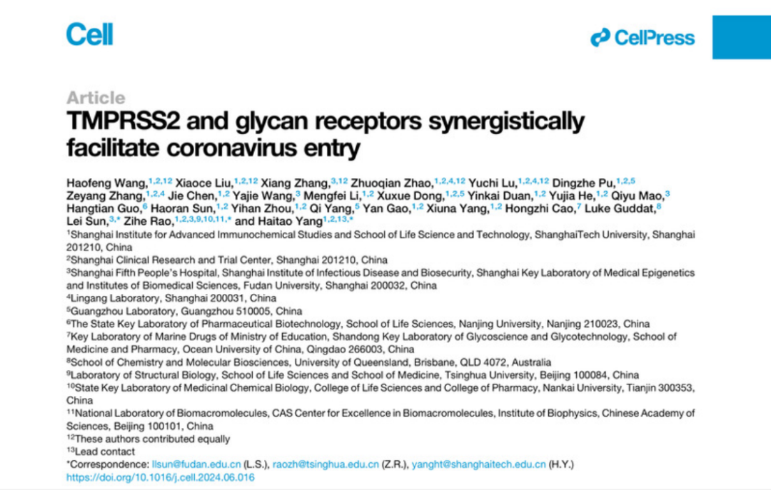 2024年7月3日,复旦大学生物医学研究院研究员孙蕾和上海科技大学免疫化学研究所教授杨海涛、免化所特聘教授/清华大学教授饶子和院士等在《细胞》(Cell)上共同发表了题为“TMPRSS2 and glycan receptors synergistically facilitate coronavirus entry”的最新研究,揭示了人类冠状病毒HKU1(HCoV-HKU1)同时利用细胞表面糖受体和蛋白受体入侵人体的精确分子机制,并首次发现这两类受体在病毒入侵过程中展现出协同的工作机制。该研究不仅拓展了对冠状病毒如何入侵宿主这一关键过程的理解和认识,解决了冠状病毒受体研究领域长期以来悬而未决的一个关键科学问题,也为开发抗冠状病毒的新策略奠定了重要理论基础。