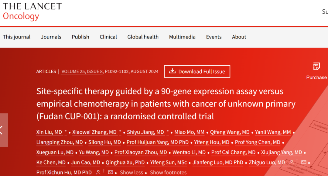 2024年7月25日,复旦大学附属肿瘤医院胡夕春教授、罗志国教授领衔团队于肿瘤学期刊《柳叶刀·肿瘤学》(The Lancet Oncology)在线发表了题为“Site-specific therapy guided by a 90-gene expression assay versus empirical chemotherapy in patients with cancer of unknown primary (Fudan CUP-001): a randomised controlled trial”重要临床研究,发布了全球首个针对原发不明肿瘤的前瞻性随机对照临床研究成果,在国际上首次证实了原发不明肿瘤进行“部位特异性治疗”的有效性。研究表明,通过基因检测技术预测原发不明肿瘤患者的肿瘤组织起源,并进行“部位特异性治疗”的患者,中位无进展生存期达到9.6个月,显著优于“传统经验性化疗”方案的6.6个月,疾病进展风险降低32%,中位总生存延长9个月,有望成为原发不明肿瘤患者治疗新选择。