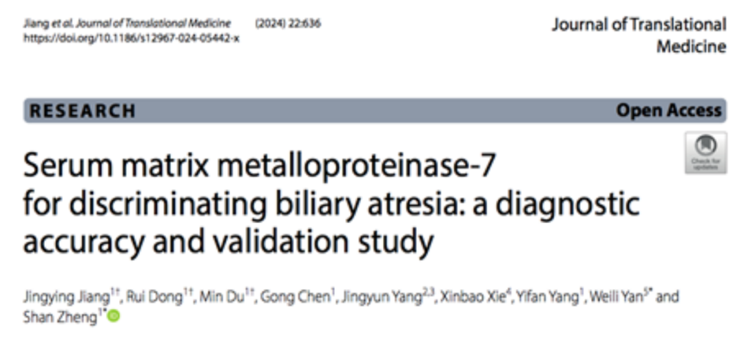 2024年7月8日,复旦大学附属儿科医院郑珊教授团队在Journal of Translational Medicine杂志发表题为“Serum matrix metalloproteinase-7 for discriminating biliary atresia: A diagnostic accuracy and validation study”的研究论文。此研究结果已广泛推广并应用于胆道闭锁术前诊断流程,并通过了多中心前瞻性样本的验证(中华小儿外科杂志,2023年),有望将胆道闭锁的手术日龄进一步提前,改善胆道闭锁患儿预后。