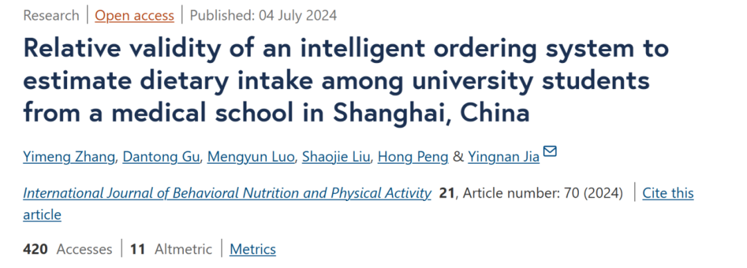 2024年7月4日,复旦大学公共卫生学院贾英男团队在行为科学领域期刊International Journal of Behavioral Nutrition and Physical Activity,发表了题为“Relative validity of an intelligent ordering system to estimate dietary intake among university students from a medical school in Shanghai, China”的研究论文,报道了校园智慧点餐系统所收集的在校膳食数据能够高效、准确地评估学生的日常膳食摄入情况。