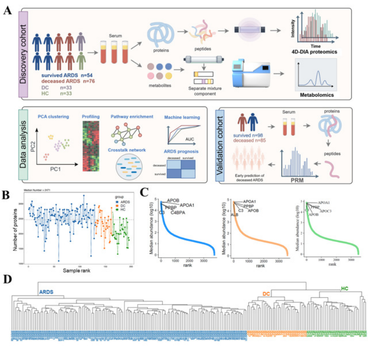 2024年7月2日,复旦大学公共卫生学院王伟炳团队与复旦大学附属中山医院宋振举教授团队在急危重症领域期刊Critical Care,发表了题为 “Integrative multi‑omics analysis unravels the host response landscape and reveals a serum protein panel for early prognosis prediction for ARDS”的研究论文,报道了急性呼吸窘迫综合征(ARDS)的潜在生物学机制和治疗靶点。寻求有效的治疗和精确的预后预测方法对于提高ARDS患者的生存一直以来是医学界广泛关注的重点。该研究使用蛋白质组和代谢组全面分析ARDS的生物学特征和潜在机制,可以为ARDS治疗和预后预测研究提供全新的视角。