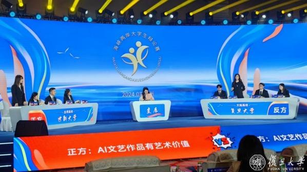 决赛题目是“AI文艺作品有/没有艺术价值”。尽管该题目与初赛一致,但初赛时复旦持正方,决赛时则持反方。持方转化好似左右互搏,要求辩手抛弃原有的思维框架,从另一个角度重新理解题目中的“艺术价值”。备赛时,郑诗亮和于泽洲在群聊中出谋划策,从卡夫卡到张大千,从冰裂纹到宣德炉,极大优化了反方的例证与表达,助力复旦最终取得冠军。