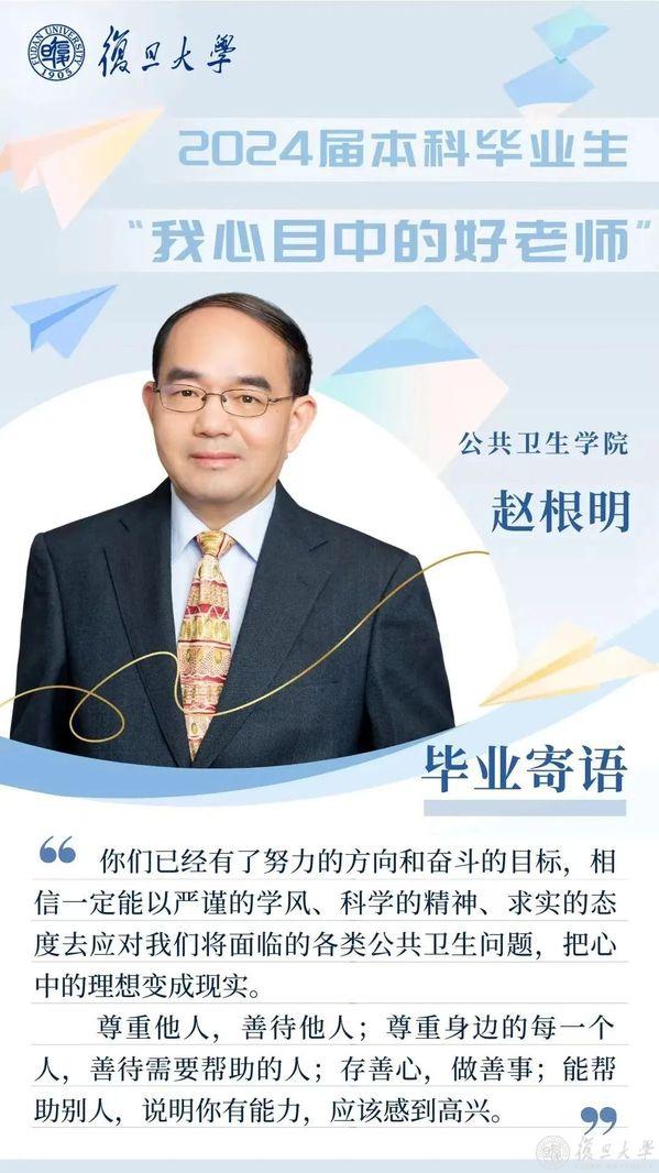 经各院系学生推选、组织推荐,全校共产生10位“我心目中的好老师”。其中,复旦上医获评3人,让我们一起走进公共卫生学院赵根明老师、药学院姜琳琳老师和中山医院钱菊英老师的育人事迹,感悟他们为毕业生写下的谆谆嘱托,近距离感受复旦好老师各种“范儿”,铭记师恩、不懈奋斗。