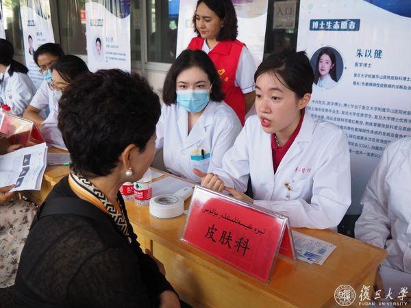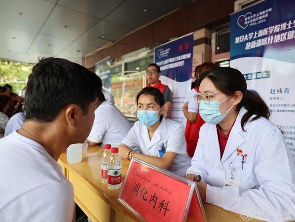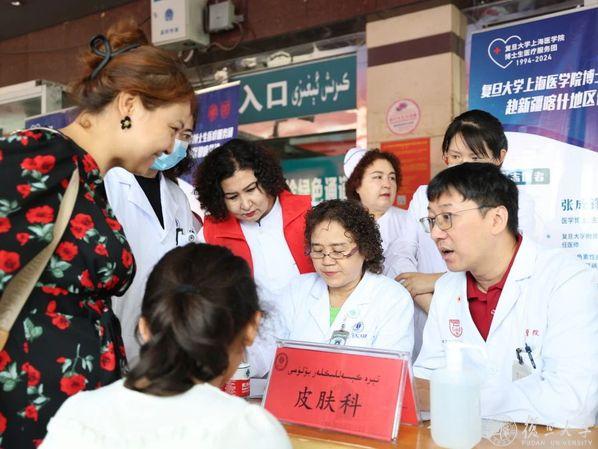 深情无限,大爱兴疆。8月5日至8月9日,复旦大学上海医学院博士生医疗服务团(以下简称“博医团”)深入新疆维吾尔自治区喀什地区,开展医疗卫生志愿服务活动。这也是博医团成立三十周年系列志愿服务活动的“收官站”。新疆线由复旦大学附属华山医院牵头组织,来自中山医院、华山医院、妇产科医院、儿科医院、眼耳鼻喉科医院的援疆医生共同参与。围绕当地百姓及基层医院的实际需求,一支涵盖普外科、风湿免疫科、内分泌科、骨科、运动医学科、皮肤科、感染科、神经内科、心内科、耳鼻喉科、妇产科、儿科等多个科室专家志愿者和博士生志愿者组成的队伍深入南疆重镇喀什地区,通过大型义诊、送医入户、科普宣教等多种方式为当地群众带去优质医疗服务。