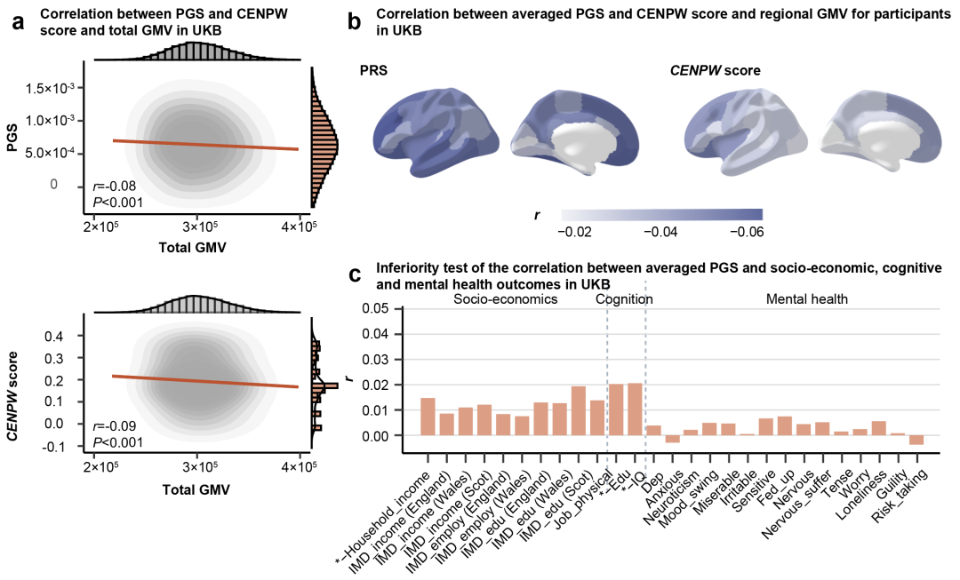 为了进一步识别青少年期脑发育特征对于成年中后期发展的影响,研究者同样在UK Biobank中计算了晚发育有关的PGS和CENPW分数,并发现这些分数与总灰质体积的负相关关系,说明第三组发育迟缓中青少年期至成年早期的并不能使其达到正常发育过程中的峰值水平。然而,非优效性检验结果显示,晚发育对于成年期社会经济结局、精神健康以及认知的不良影响是有局限性的。