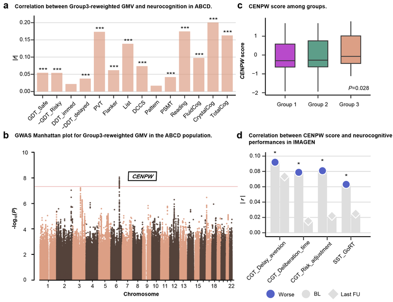 为了进一步识别脑发育特征有关的基因和表观遗传变异,研究者进行了全基因组(Genome-wide association study; GWAS)和表观基因组(Epigenome-wide association study; EWAS)关联分析。由于IMAGEN的样本量有限,研究者将两组间回归所得最大区别的前十个脑区作为预测变量,通过在另一个有近10000人的大型儿童样本中ABCD里估计参与者被归于某组的倾向性评分连接不同的数据集,识别出与晚发育(即第三组)有关的一个独立基因座。该基因座定位在与神经发育和凋亡有关的CENPW基因上。并且,晚发育有关的全基因组评分(polygenic score; PGS)和该基因相关评分(CENPW score)都在IMAGEN中被发现与第三组以及第三组所表现出来的神经认知表现特征有着明显的关系。