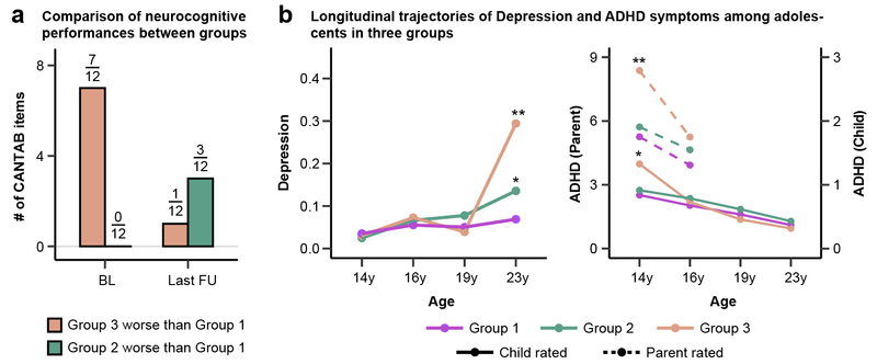 与第一组相比,第二组在神经认知表现(Cambridge Neuropsychological Test Automated Battery;CANTAB)和精神疾病风险上,最后一次随访时相较基线出现持续下降的趋势。与之相反的是,虽然第三组神经发育延迟者在基线时表现出较差的神经认知表现,包括空间工作记忆和决策调整等任务,并且有着显著增加的注意力缺陷多动障碍(Attention-deficit/hyperactivity disorder; ADHD)症状,但可随着大脑成熟逐渐改善。然而第三组的抑郁症状却明显增加。