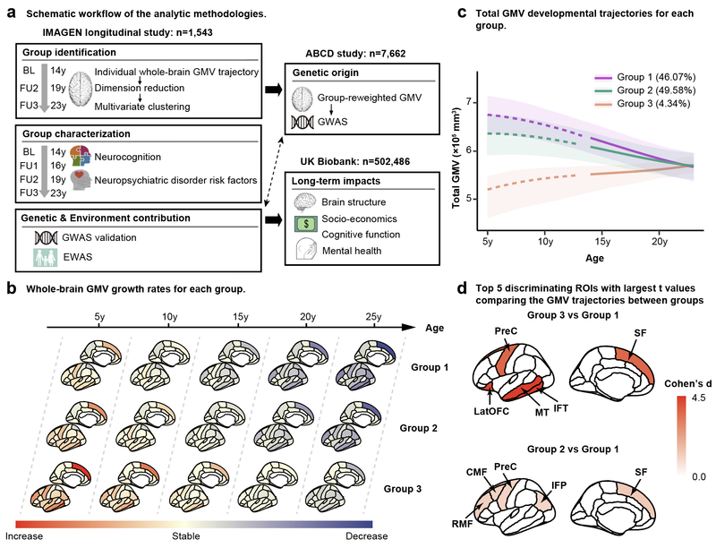 该研究纳入了IMAGEN中至少有两次神经影像随访共计1,543名青少年,首先面对重复测量纵向数据利用随机效应模型估计脑区特异性个体灰质体积发育系数,再在主成分分析降维后用K-means聚类方法将青少年人群分为三类。两组人有着与该时期内正常脑发育轨迹相匹配的发育特征,即总体脑灰质体积呈现下降趋势,但在基线脑灰质体积上有所不同;其中有较高基线脑灰质体积的为第一组,且该组总认知分数最高,较低体积的为第二组。剩余一组人的脑发育轨迹则相反,呈现上升趋势,仅包含不到总人群的5%。这组人与前两组相比,脑发育轨迹差异最大的主要在执行功能(executive function)所在的区域。由于人群里灰质体积随年龄通常表现为上升在9岁左右到达峰值后下降的倒U形曲线,研究团队将第三组概括为晚发育的一组。