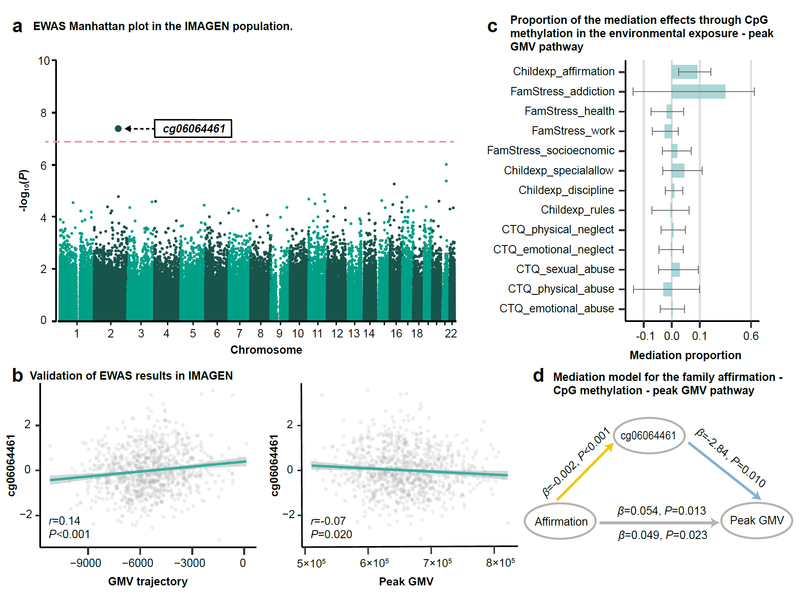 接着,研究者发现了一个与第二组有关的表观遗传甲基化位点(cg06064461),并确认了该位点的甲基化水平在家庭鼓励与脑灰质体积可达峰值之间的中介效应。这个位点定位在ATF2和MIR933基因上。这两个基因通过调节脑源性神经营养因子介导神经退化和神经发生等过程。