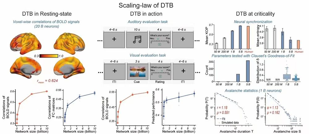 数字孪生脑的标度定律(Scaling-law):静息态与任务态的相似性随网络规模增加而增加,并逐渐展现出类似在人脑中观测到的临界现象
