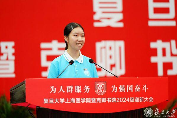 2024级临床五年制中山班吴佳凝作为新生代表发言。她代表全体新生感谢师长和亲友在过去给予的能量和勇气,让大家有机会来到复旦大学上海医学院,追逐人生下一阶段的理想。“医学之路漫长,唯有热爱可抵岁月山海”,面对未来,吴佳凝充满了憧憬。回望过去,从儿时对医生懵懂的崇敬,到生病被治好时的感激,再到某一天自己也想要站出来,为这个世界做一些实质性的贡献——医学,一直不变地,在心中占据着重要的位置。“有了爱与理想,我们方能不畏艰辛,勇往直前,直挂云帆济沧海;我们方能心怀无私,学会利他和奉献,为人群服务。”