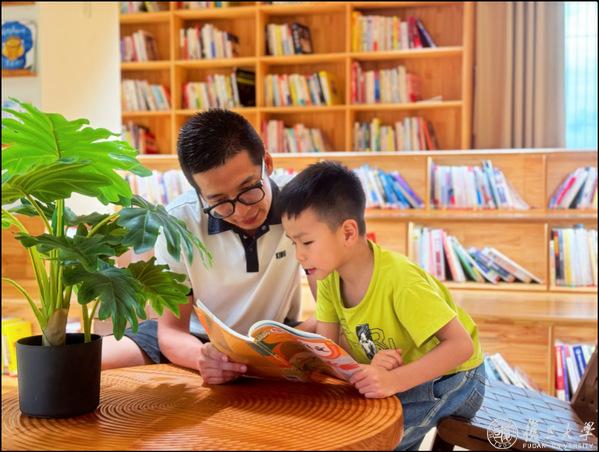 来自广东省潮州市的林希杰正和爸爸一起在图书馆阅读