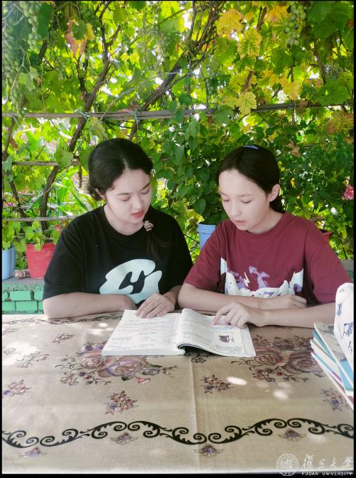 来自新疆伊犁哈萨克自治州的迪丽萨拉姆·吐尔汗江姐妹俩正一起阅读