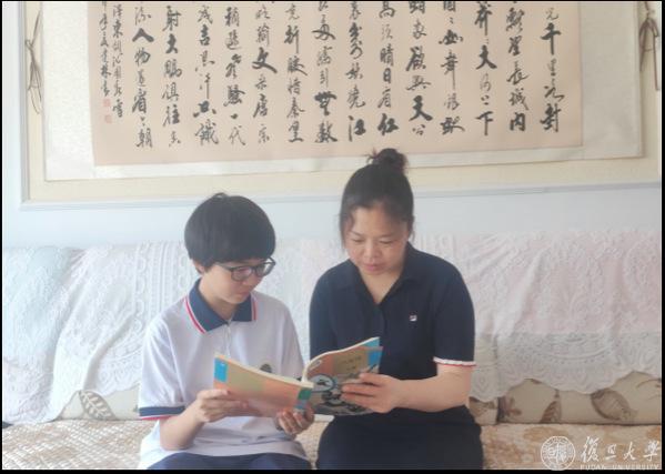 来自上海市杨浦区的潘子葵正和妈妈一起阅读语文课本
