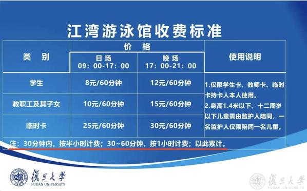 复旦游泳馆半小时起游!国庆“黄金周”去江湾游泳馆、枫林游泳馆运动的师生享受了这一福利。游泳馆计费最低可按半小时而非1小时起算,师生最低入场费用降低为4元。