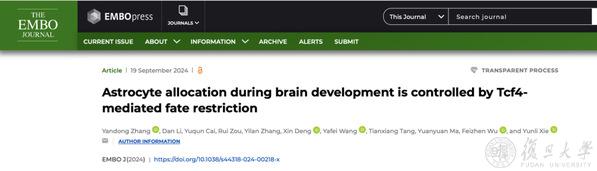 2024年9月19日,复旦大学脑科学研究院解云礼团队在《欧洲分子生物学组织期刊》(The EMBO Journal)发表了题为 “Astrocyte allocation during brain development is controlled by Tcf4-mediated fate restriction” 的文章。该研究发现,转录因子 Tcf4 通过对腹侧大脑神经干细胞来源的少突胶质细胞前体细胞的命运进行限制,能抑制星形胶质细胞的命运,从而精准调控星形胶质细胞在背侧新皮层的定位。