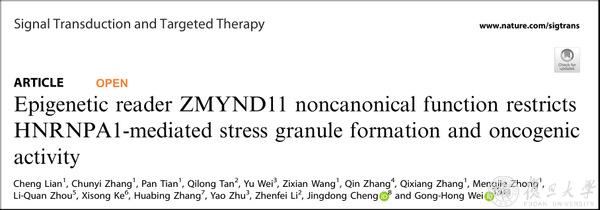 2024年9月28日,复旦大学基础医学院卫功宏课题组在《信号传导与靶向治疗》(Signal Transduction and Targeted Therapy)期刊上发表了题为“Epigenetic reader ZMYND11 noncanonical function restricts HNRNPA1-mediated stress granule formation and oncogenic activity”的研究论文。该研究首次揭示了ZMYND11作为非组蛋白HNRNPA1甲基读码器的非经典新功能,发现精氨酸甲基化介导的ZMYND11-HNRNPA1-PKM2轴限制肿瘤进展的机制,并提出了ZMYND11具有作为癌症治疗靶点的潜在应用场景,特别是在肿瘤环境中,蛋白精氨酸甲基转移酶PRMT5抑制剂被提出为一种可能的临床治疗手段。