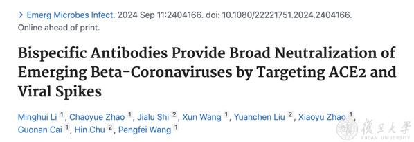 2024年9月11日,上海市重大传染病和生物安全研究院/复旦大学生命科学学院王鹏飞团队联合香港大学微生物系朱轩团队于《新兴微生物与感染》(Emerging Microbes & Infections)发表题为“Bispecific Antibodies Provide Broad Neutralization of Emerging Beta-Coronaviruses by Targeting ACE2 and Viral Spikes ”的论文。该研究成果表明双特异性抗体(bsAbs)不仅能中和SARS-CoV-2及其变种,还可广泛适用于其他β冠状病毒,包括SARS-CoV、MERS-CoV以及动物来源的冠状病毒。这些bsAbs展现出对多种致病株及其变异的持续有效性,其全面的中和谱使它们成为未来疗法开发的有力候选者。