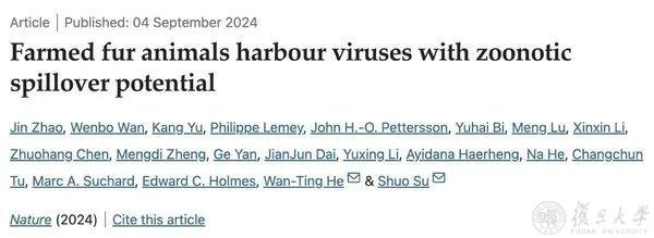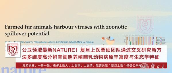 2024年9月4日,复旦大学公共卫生学院、上海市重大传染病和生物安全研究院粟硕团队与合作者在《自然》(Nature)杂志发表题为“Farmed fur animals harbor viruses with zoonotic spillover potential”的研究性论文,应用前沿交叉研究方法揭示多种养殖哺乳动物中的高分辨率病毒基因组序列组成、潜在跨物种传播风险和生态学特征,将为构建多维度公共卫生风险评估与新发传染病预测预报体系提供数据支持。