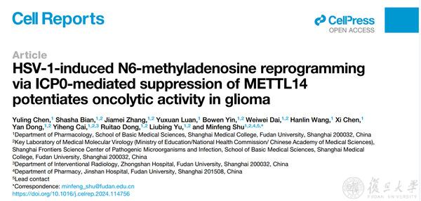 2024年9月25日,复旦大学基础医学院药理学系、复旦大学上海医学院医学分子病毒学教育部/卫健委/医科院重点实验室、上海市病原微生物与感染前沿科学研究基地束敏峰团队在《细胞报告》(Cell Reports)上发表了题为“HSV-1-induced N6-methyladenosine reprogramming via ICP0-mediated suppression of METTL14 potentiates oncolytic activity in glioma” 的研究论文。该研究发现,溶瘤单疱病毒HSV-1在感染早期通过病毒即早蛋白ICP0直接降解胶质瘤细胞中的METTL14蛋白,抑制ISG15驱动的宿主抗病毒作用,从而增强HSV-1的溶瘤活性。这为胶质瘤的治疗提供了一种潜在的策略。