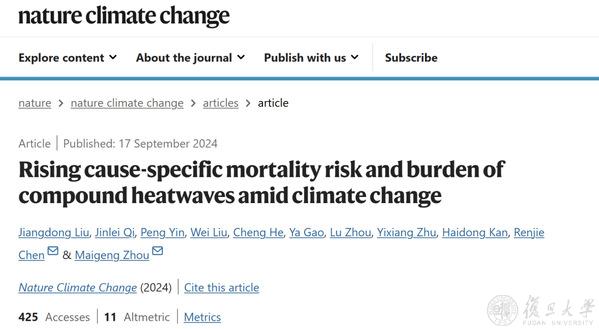 2024年9月17日,复旦大学公共卫生学院陈仁杰团队与中国疾病预防控制中心慢性非传染性疾病预防控制中心周脉耕研究员团队联合在《自然-气候变化》(Nature Climate Change)发表题为“Rising cause-specific mortality risk and burden of compound heatwaves amid climate change”的研究。该研究系统评估了不同类型热浪对我国心肺疾病相关死亡的影响,并预测了气候变化与人口老龄化背景下未来的疾病负担。