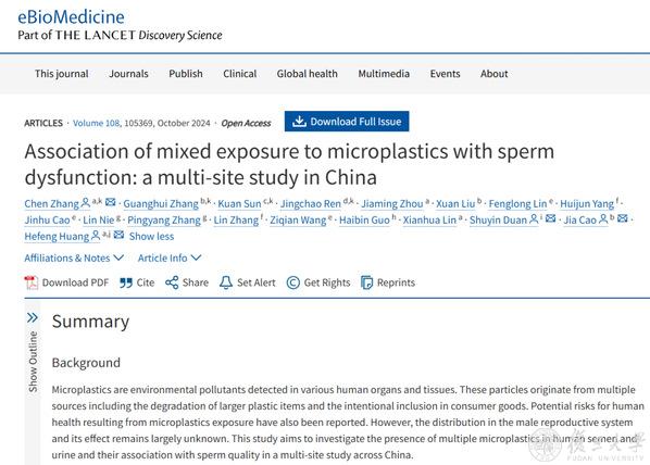2024年9月28日,复旦大学附属妇产科医院/生殖与发育研究院、浙江大学医学遗传与发育研究院黄荷凤课题组在《柳叶刀》(Lancet)子刊《电子生物医学》(eBioMedicine)上发表题为“Association of mixed exposure to microplastics with sperm dysfunction: a multi-site study in China的研究论文。研究发现”,中国三个地区所有参与男性的精液和尿液样本中均检测到了微塑料,且通常暴露于3-5种不同类型的微塑料中,暴露类型均类似。值得注意的是,聚四氟乙烯(PTFE)——一种常用于不粘锅涂层的材料,其暴露与精子质量的显著下降密切相关,影响精子总数、精子浓度和精子活力。