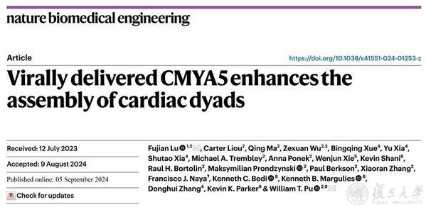 2024年9月5日,复旦大学生物医学研究院、中山医院心内科、上海心血管病研究所的路福建研究员和哈佛医学院波士顿儿童医院William Pu教授在《自然-生物医学工程》(Nature Biomedical Engineering)上发表题为“Virally delivered CMYA5 enhances the assembly of cardiac dyads”的研究论文。该研究揭示了心力衰竭的重要致病机制—CMYA5表达水平降低,并发明了一种可通过腺相关病毒(AAV)载体递送的微型化CMYA5蛋白(miniCMYA5)。心脏特异性表达miniCMYA5稳固了dyad的结构,显著改善心脏功能,并在hiPSC-CMs中启动了dyad的组装,为心力衰竭的治疗和hiPSC-CMs的体外成熟提供了新方法。