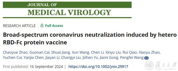 2024年9月16日,上海重大传染病和生物安全研究院/复旦大学生命科学学院王鹏飞团队在期刊《医学病毒学杂志》(Journal of Medical Virology)发表题为“Broad‐spectrum coronavirus neutralization induced by hetero RBD‐Fc protein vaccine”的研究论文。该研究利用“Knob-into-Hole”技术,构建了多种异源二聚体和四聚体RBD-Fc蛋白疫苗,这种新型的重组蛋白候选疫苗能够对包括SARS-CoV、SARS-CoV-2和MERS-CoV在内的多种冠状病毒的中和抗体。