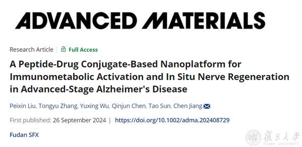 2024年9月26日,复旦大学药学院蒋晨教授团队设计了一种多肽药物偶联物(PDC),构建了一种PDC共递送平台,该研究以 “A Peptide-Drug Conjugate-Based Nanoplatform for Immunometabolic Activation and In Situ Nerve Regeneration in Advanced-Stage Alzheimer's Disease”为题,发表于最新一期《先进材料》(Advanced Materials)。团队首先合成了偶联胶质细胞调控药物的两种PDC,通过静电吸附和共价交联的方式搭载于聚多巴胺(PDA)纳米粒表面;经静脉注射后,该递送平台通过转胞吞作用跨过BBB,在脑内炎症微环境中解离并释放两种PDC靶向胶质细胞;羟基氯喹(HCQ)被靶向递入小胶质细胞,激活免疫反应并恢复能量代谢;而全反式维甲酸(ATRA)被靶向递入星形胶质细胞,促进其转分化,同时减轻炎症水平。本研究摒弃了传统以神经元为核心的脑部疾病治疗策略,展示了一种调控休眠胶质细胞治疗AD的新方法。同时,该研究提供了一种PDC靶向递送的新策略,为疾病的多靶点治疗提供新的思路。