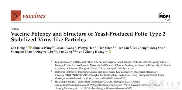 2024年9月20日,上海市重大传染病和生物安全研究院黄忠团队、中国科学院分子细胞科学卓越创新中心上海生物化学与细胞生物学研究所丛尧团队和华淞(上海)生物医药科技有限公司刘庆伟团队共同在《疫苗》(Vaccines)上发表题为“Vaccine Potency and Structure of Yeast-Produced Polio Type 2 Stabilized Virus-like Particles”的研究论文,该论文报道了利用酵母重组表达系统高效制备PV2的病毒样颗粒(Virus-Like Particle,VLP)作为候选疫苗,并系统地研究其抗原性、热稳定性、免疫原性及结构特征。