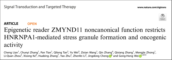 2024年9月28日,复旦大学基础医学院卫功宏课题组在Signal Transduction and Targeted Therapy期刊上发表了题为“Epigenetic reader ZMYND11 noncanonical function restricts HNRNPA1-mediated stress granule formation and oncogenic activity”的研究论文。该研究首次揭示了ZMYND11作为非组蛋白HNRNPA1甲基读码器的非经典新功能,发现精氨酸甲基化介导的ZMYND11-HNRNPA1-PKM2轴限制肿瘤进展的机制,并提出了ZMYND11具有作为癌症治疗靶点的潜在应用场景,特别是在肿瘤环境中,蛋白精氨酸甲基转移酶PRMT5抑制剂被提出为一种可能的临床治疗手段。