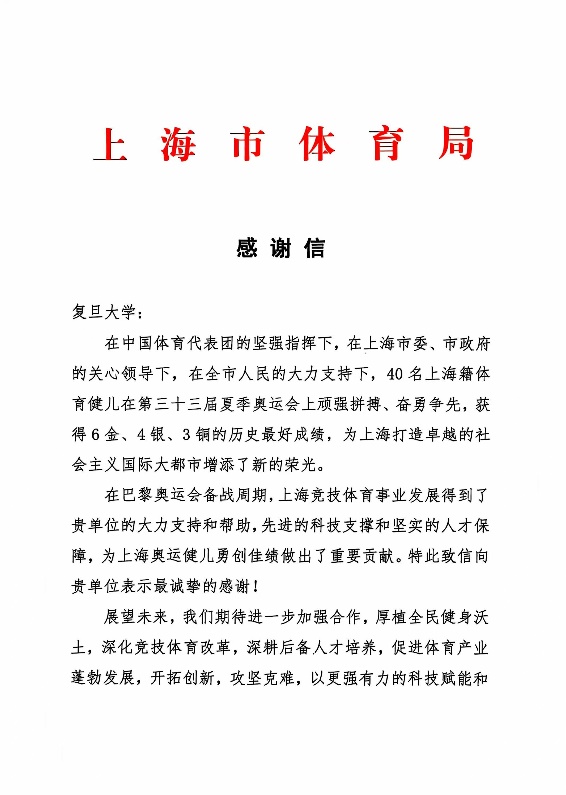近日,复旦大学收到了来自上海市体育局的感谢信。信中高度赞扬了复旦大学为第三十三届夏季奥运会提供了先进的科技支持和坚实的人才保障,为上海奥运健儿勇创佳绩做出了重要贡献。