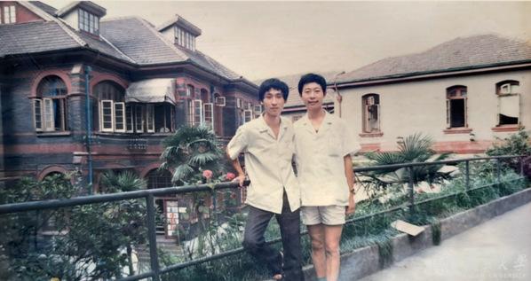 常才(左)和进修医生在黄浦院区曾经的天桥上合影