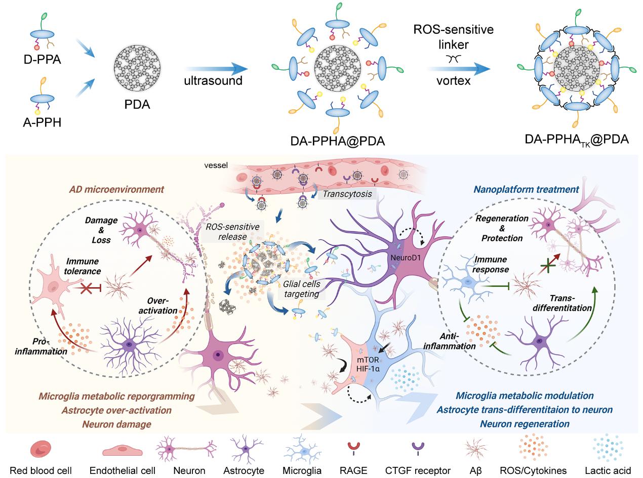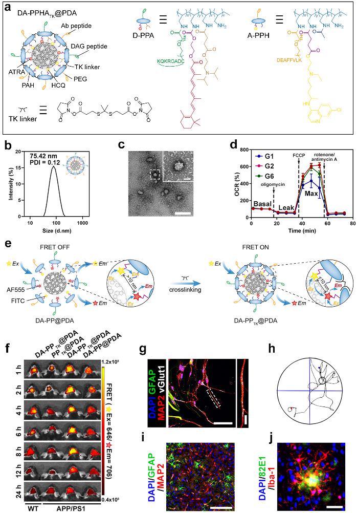 据介绍,该递送系统呈现球形结构,粒径约为75 nm左右。经体内外实验验证,DA-PPHATK@PDA能够选择性靶向胶质细胞,激活小胶质细胞代谢-免疫网络,促进毒性蛋白降解;推动星形胶质细胞干性激活,原位产生成熟功能性神经元。此外,在递送系统制备过程中意外发现交联剂的加入能够诱导FRET效应产生,从而实现AD转基因小鼠脑内炎症诊断。