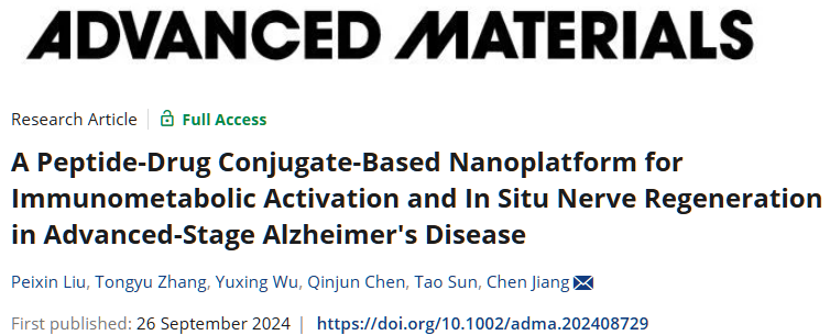 2024年9月26日,复旦大学药学院蒋晨教授研究团队在《先进材料》(Advanced Materials)发表题为“A Peptide-Drug Conjugate-Based Nanoplatform for Immunometabolic Activation and In Situ Nerve Regeneration in Advanced-Stage Alzheimer's Disease”的研究论文,展示了一种调控休眠胶质细胞治疗阿尔茨海默病(AD)的新方法,提供了一种多肽药物偶联物(PDC)靶向递送的新策略,为疾病的多靶点治疗打开新思路。