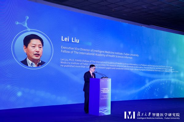 复旦大学智能医学研究院常务副院长刘雷主持会议开幕式。复旦大学上海医学院副院长、复旦大学智能医学研究院院长朱同玉和德国科学院院士Roland Eils出席开幕式现场并致欢迎词。