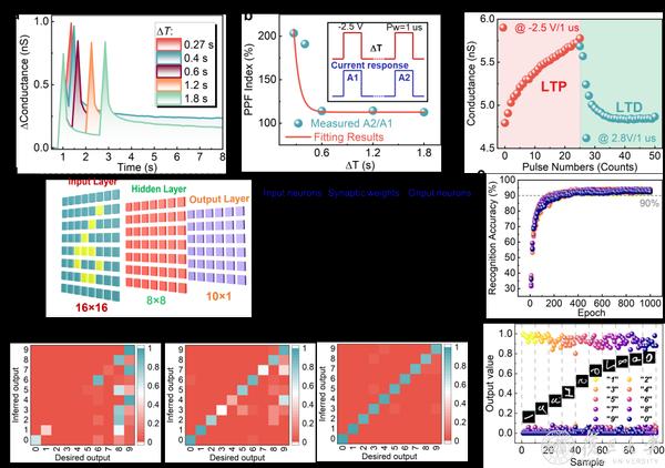 该研究采用与CMOS工艺兼容的新兴反铁电纳米材料研制了一种新原理人工突触/神经元器件。基于对称电极配置研究了不同脉冲刺激下的积分-放电-漏电 (LIF) 神经元行为特性,显示出 1.36 fJ/spike 的低发射能耗。通过引入非对称电极形成偏置电场,极化滞回特性发生偏移,形成两个可辨别的极化/电阻状态。成功实现了包括成对脉冲促进 (PPF) 和长期增强/抑制 (LTP/LTD) 在内的突触行为,功耗低至 245 aJ/spike。基于构建的人工神经网络 (ANN) 系统成功展示了手写数字识别能力,识别率高于90%。