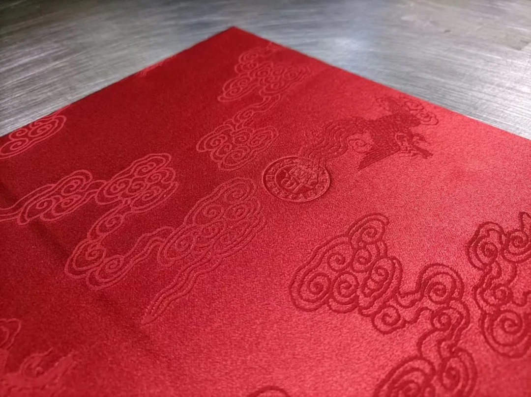 潞绸出产于山西潞安府,是历史上的中国三大名绸之一。婚书的潞绸封面浮现着祥云与龙凤图案,随着光线角度的变换而光泽流转,绮丽多姿。这批面料与今年学校录取通知书的面料也大有渊源——都由山西潞安府潞绸集团生产,都有相同的纹样。