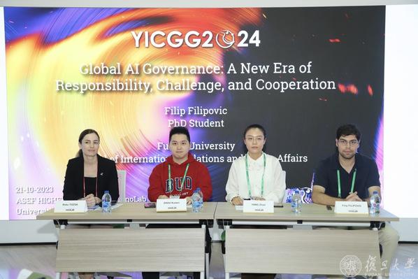 10月21日下午,复旦大学国务学院品牌项目“荣昶杯”青年全球治理创新设计大赛(YICGG)学生代表出席会议,分享YICGG2024的优秀提案,从青年的视角与亚欧高校的学者和管理人员就人工智能全球治理展开对话。
