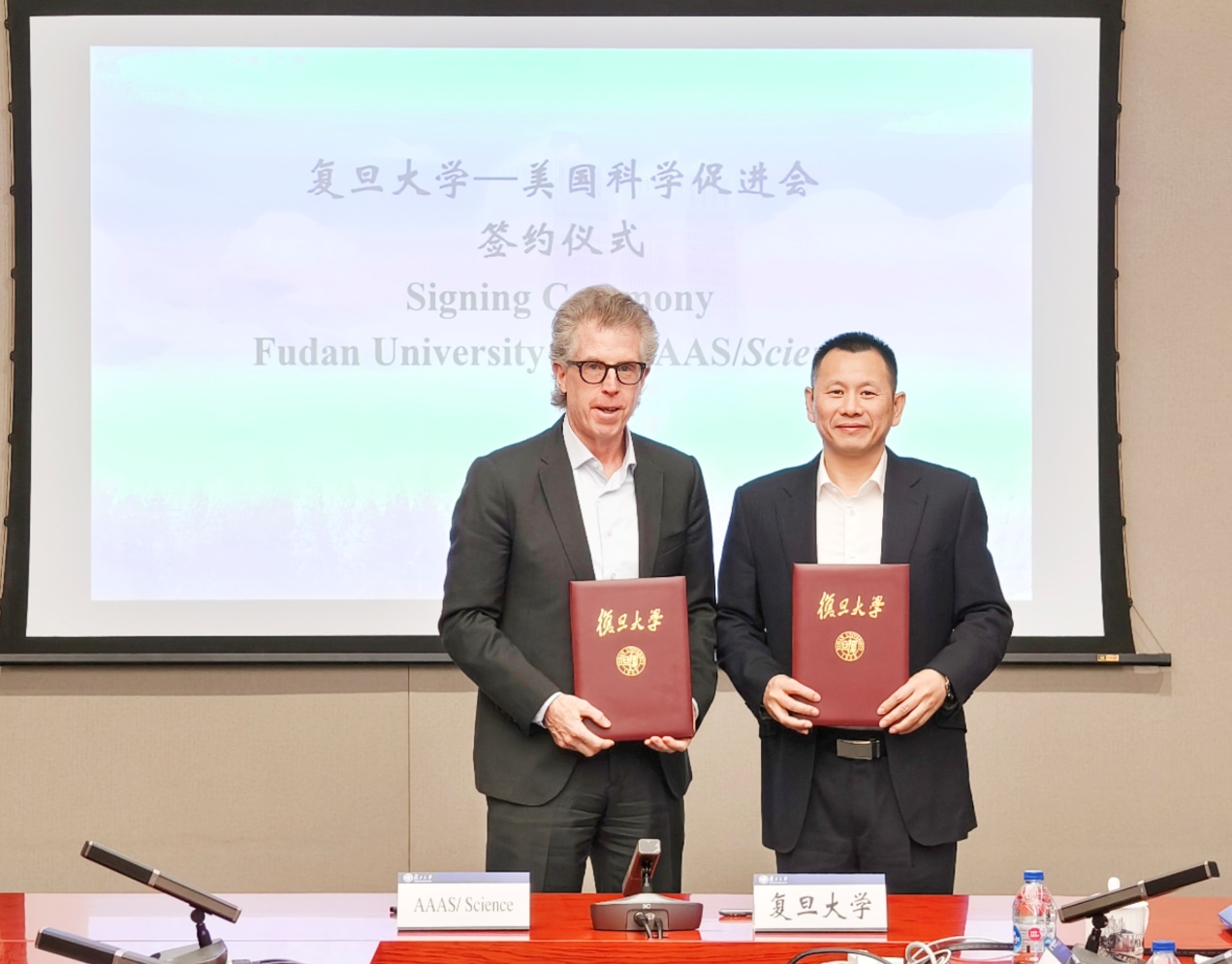 11月8日,复旦大学与美国科学促进会战略合作备忘录签约仪式在复旦大学本部校区举行。中国科学院院士、复旦大学校长助理、科学技术研究院院长彭慧胜和《科学》(Science)系列期刊出版人Bill Moran代表双方签署战略合作备忘录。
