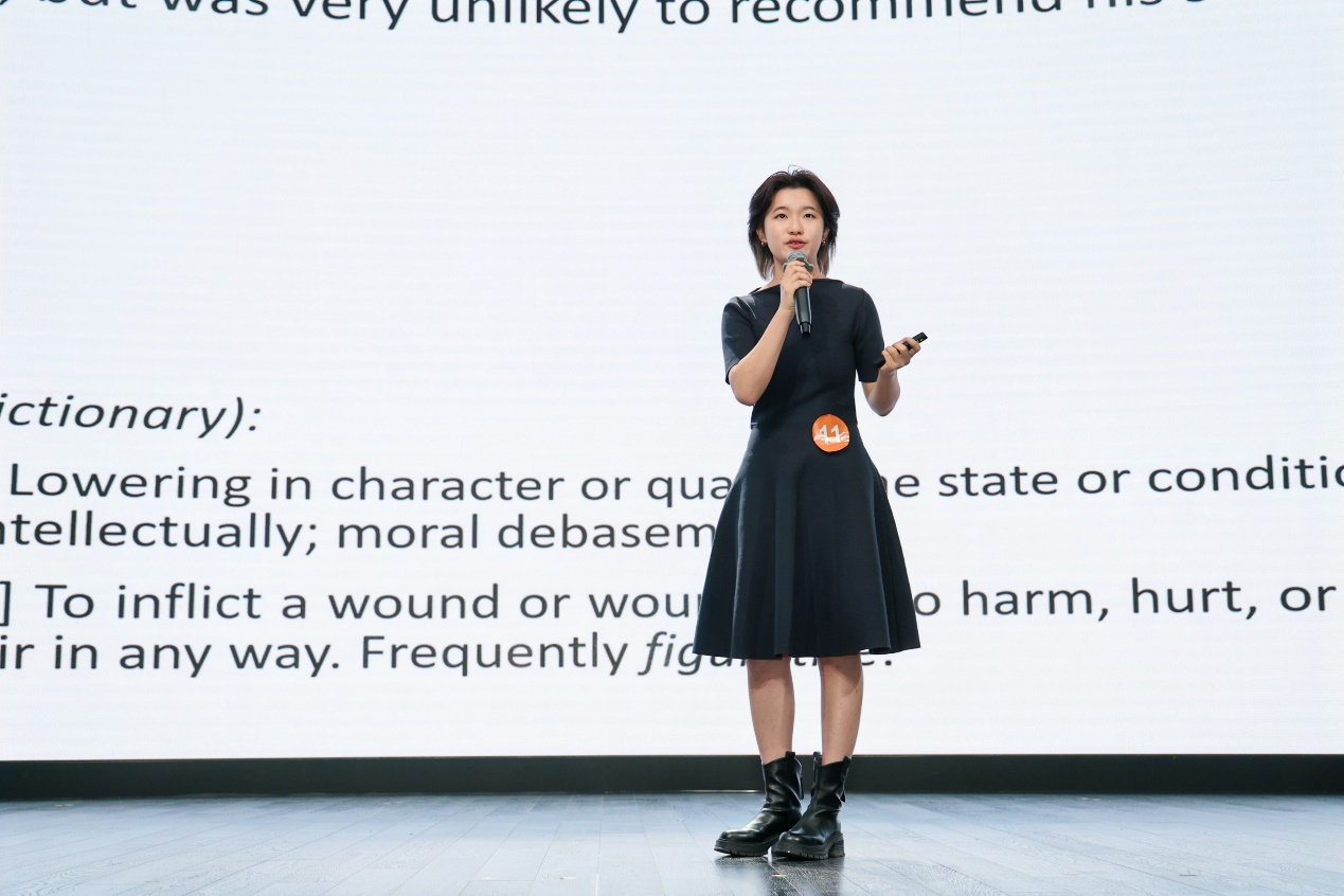 获得“通用学术英语演讲组”一等奖、来自上海外国语大学英语、国际政治双学位大四的胡浩歌同学此次分享的学术研究课题为“《傲慢与偏见》中的性别关系动态”。她在赛后兴奋地说:“聆听来自不同高校不同专业背景的同学用专业知识去尝试回答现实问题,让我感到十分振奋、深受启发!作为一名人文学科的学生,提问官的问题也促使我更加深入地思考人文学科如何在新时代中融入实际,为人类未来的改变做出贡献。”