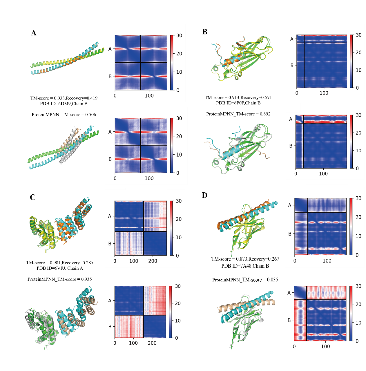 ProBID-Net(上)和ProteinMPNN(下)设计序列预测结构叠合比对与AlphaFold-Multimer预测链间PAE热图